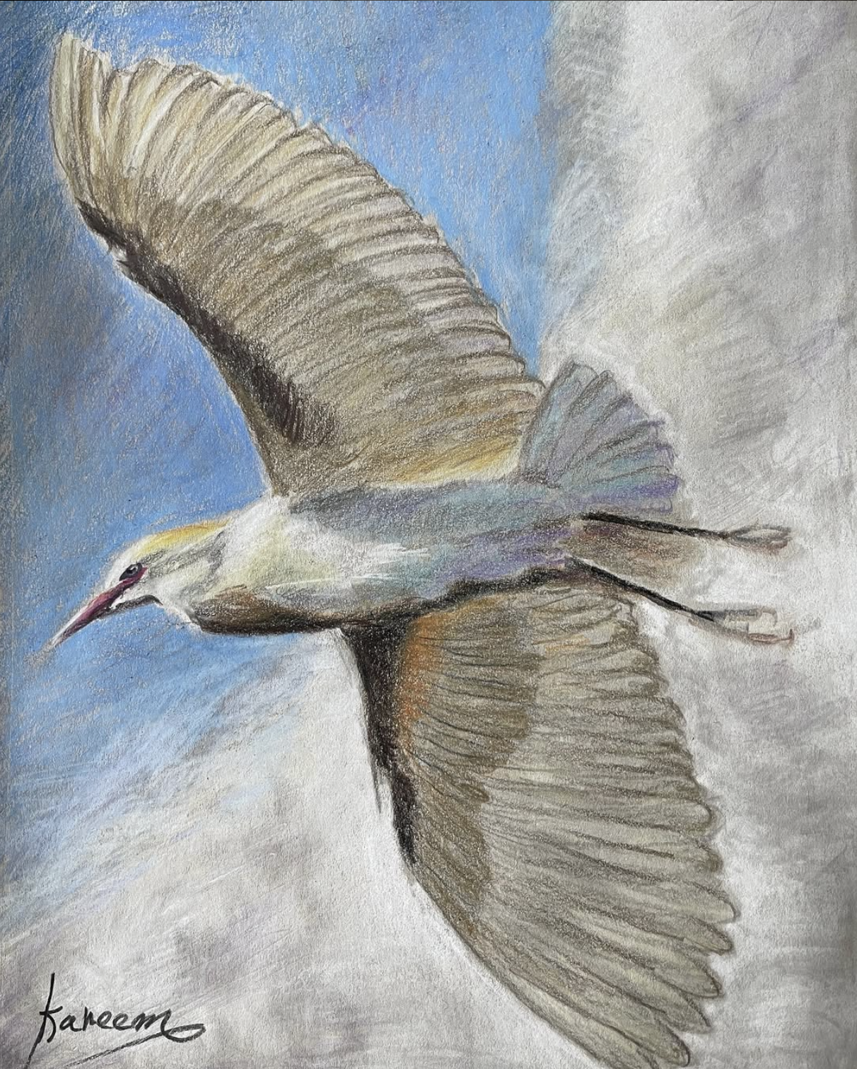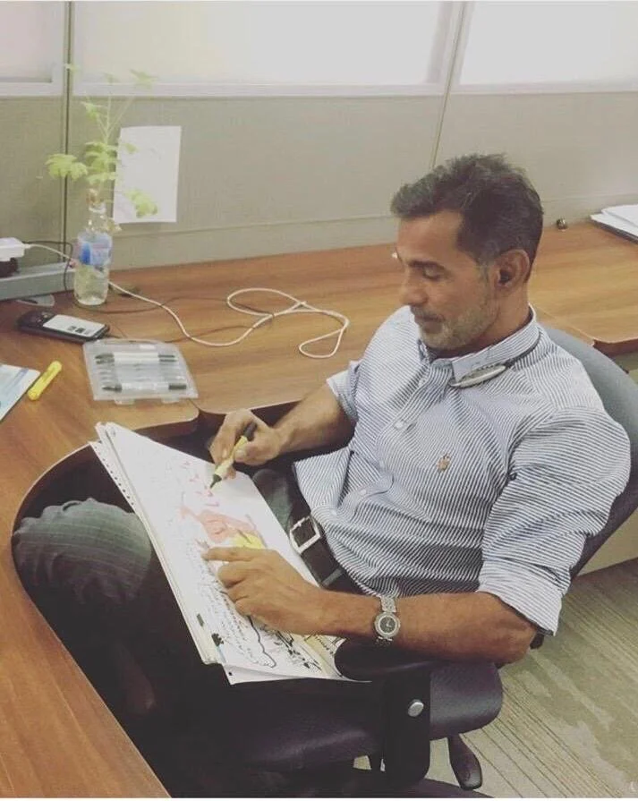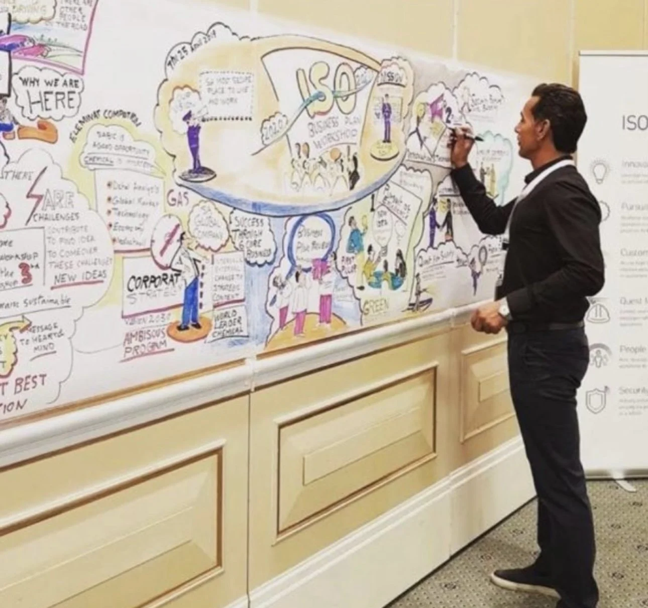 During Kareem’s career working at Saudi Aramco, he taught himself how to do live painting until it became an essential part of Aramco’s meeting where he interprets the meeting notes live in an eye-catching style as a visual summary for the event. This allowed the artist to not only be bound to his company but to be cherished guest at international events.